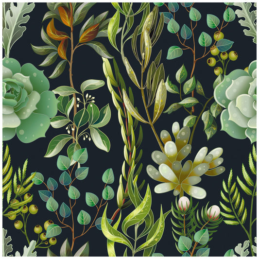 HaokHome Botanical Wallpaper – Golden Leaves and Greenery on Dark Black Background