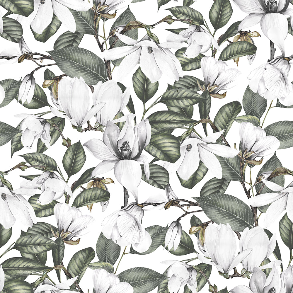 HaokHome Magnolia Floral Wallpaper – White Magnolia Flowers with Green Leaves on Soft White Background