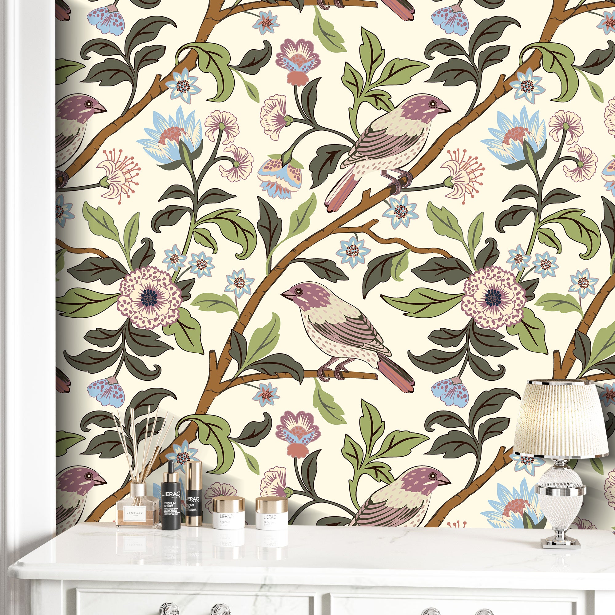 HaokHome Vintage Floral and Bird Wallpaper Soft Beige Background with Birds and Branches