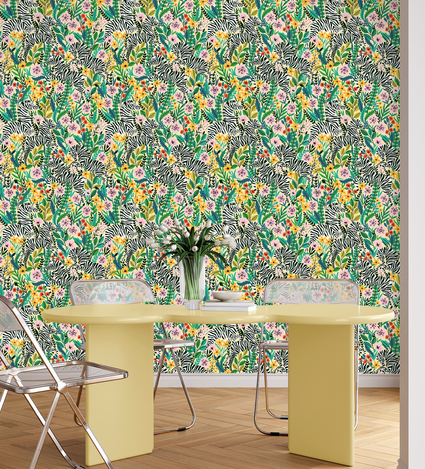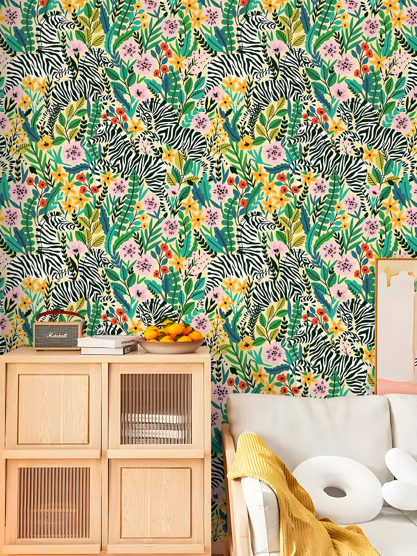 HaokHome Peel and Stick Zebra Floral Jungle Wallpaper Green Yellow Removable Wall Decor for Living Room Bedroom Nursery