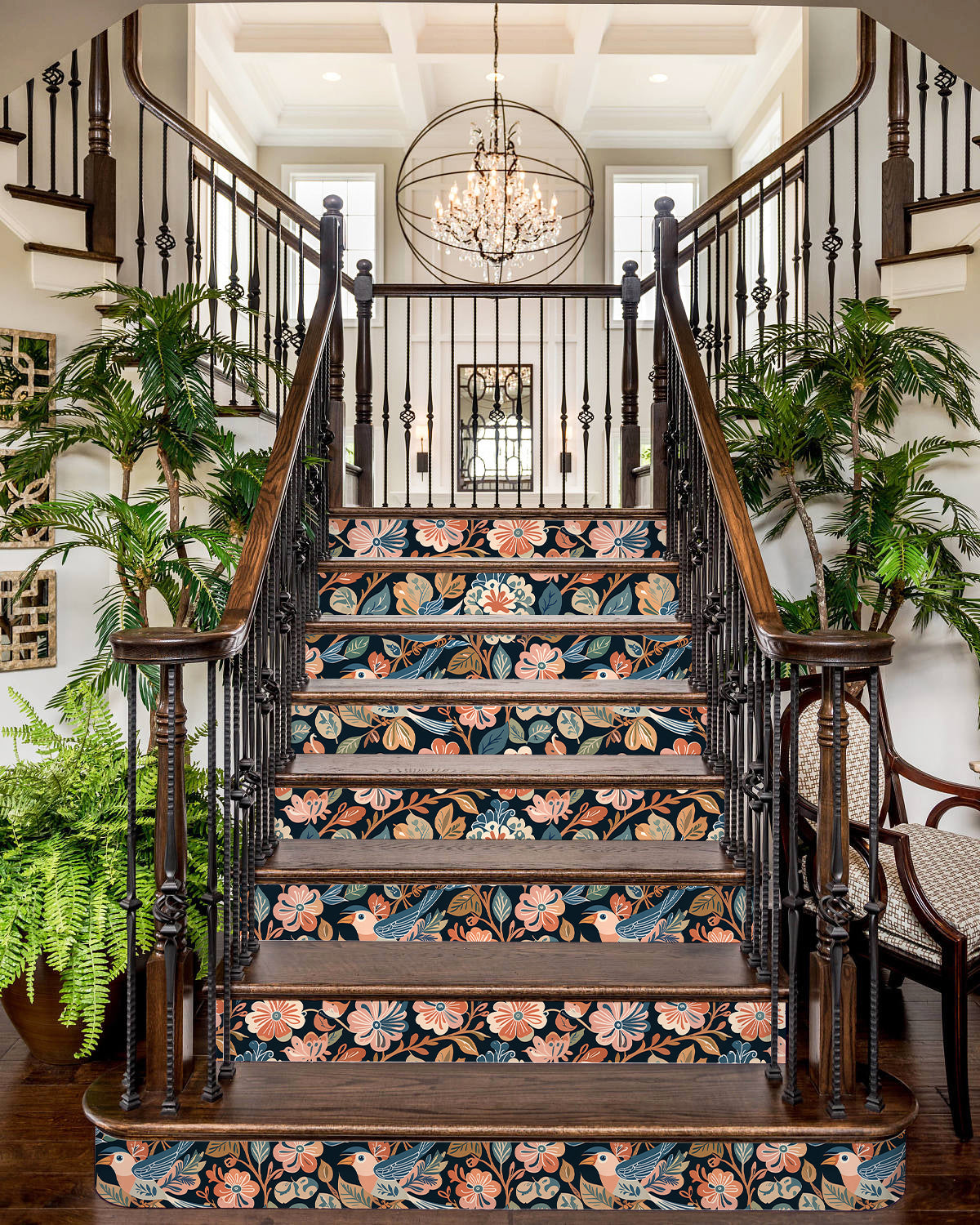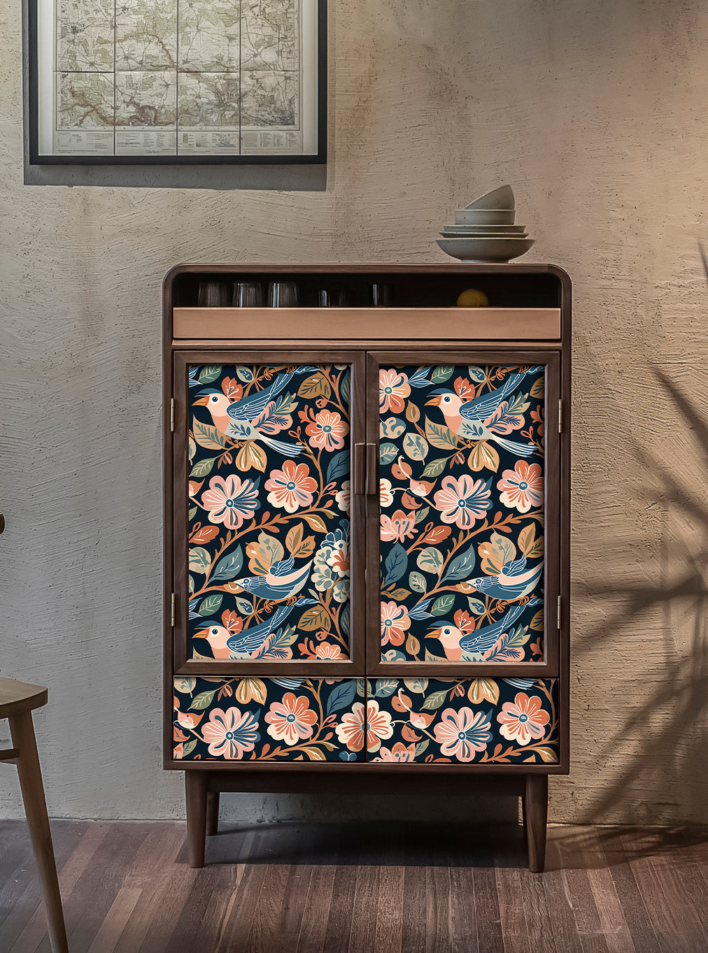 HaokHome Hand-Drawn Birds and Floral Wallpaper – Vibrant Floral Design with Birds on Dark Background for Bedroom & Living Room