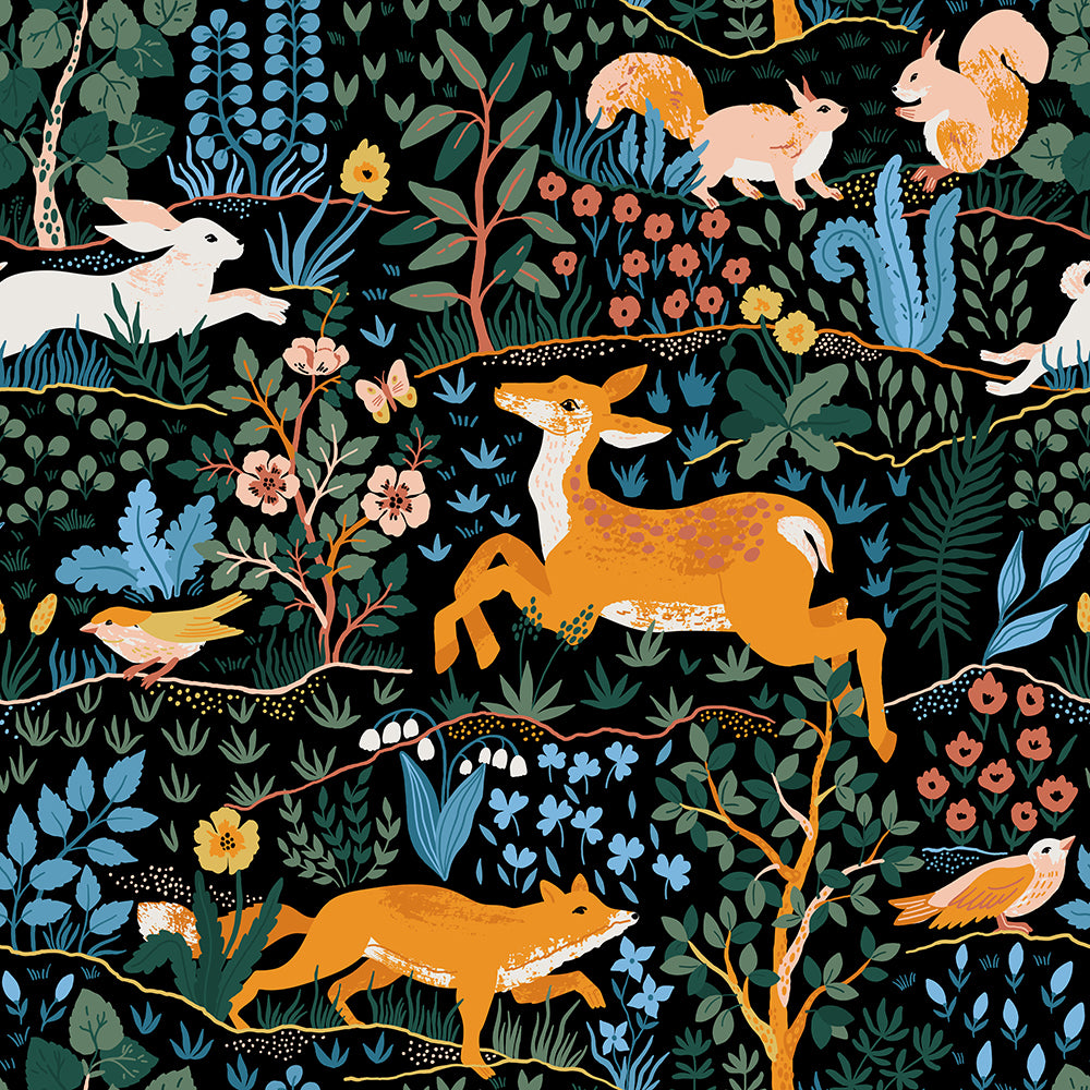 HaokHome Dark Forest Wallpaper with Deer, Fox, Rabbit, Squirrel, Birds and Botanical Motifs – Hand-Drawn Nature Mural on Black Background