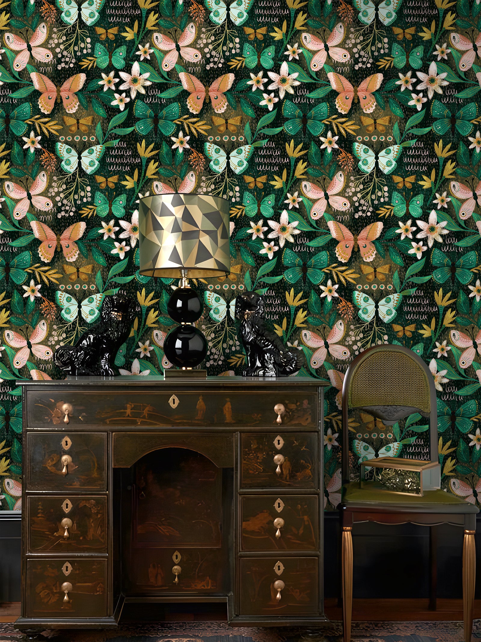 HaokHome Butterfly and Flower Wallpaper – Colorful Butterflies and Blossoms on Dark Green Background for Living Room & Bedroom