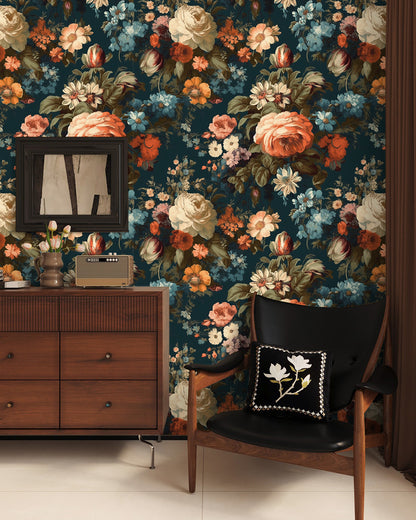 HaokHome Dark Botanical Vintage Floral Wallpaper - Orange Roses, Blue Daisies & White Peonies on Deep Teal Background