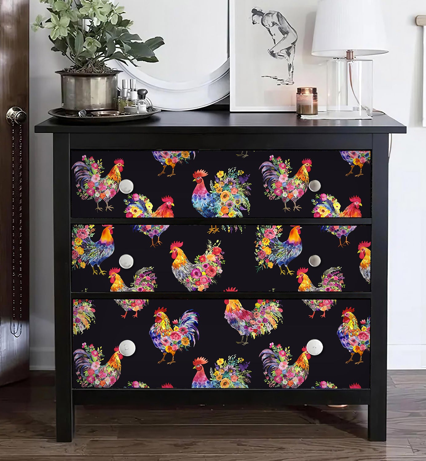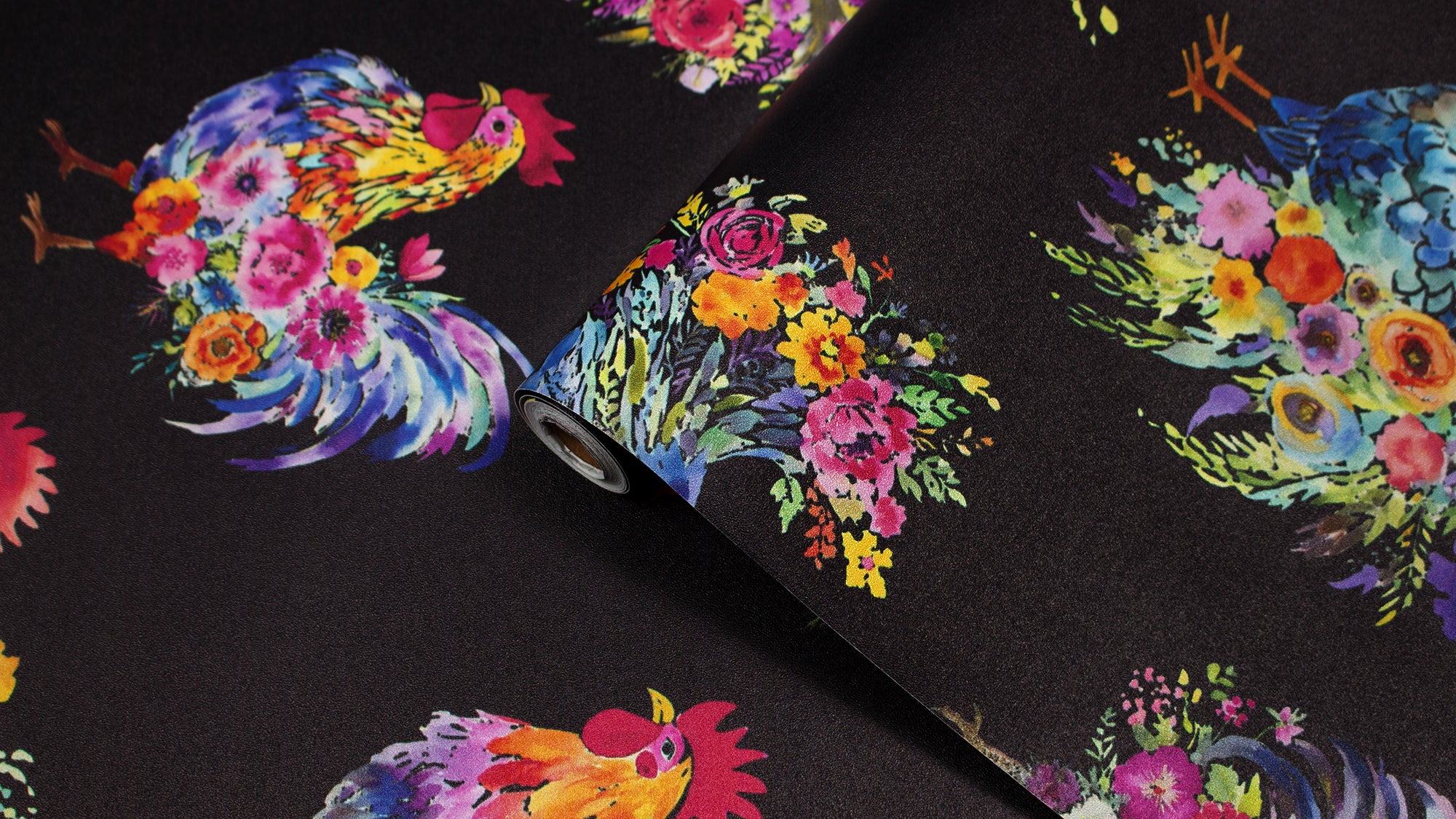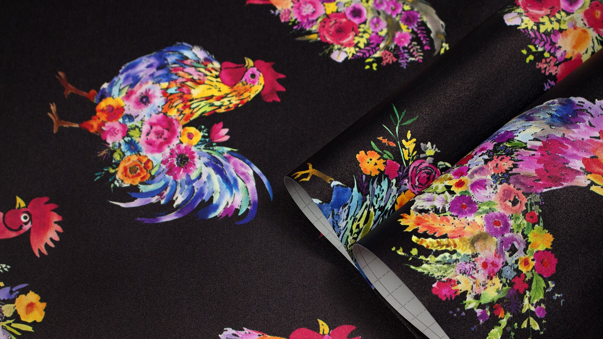 HaokHome Floral Rooster Wallpaper – Vibrant Watercolor Chicken Design on Black for Bold Farmhouse & Kitchen Decor