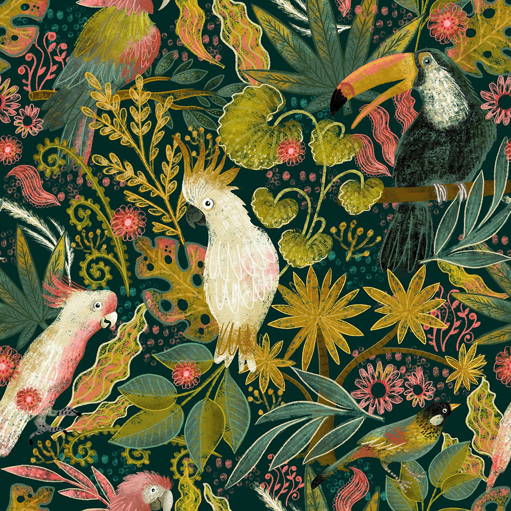 HaokHome Tropical Birds and Flowers Wallpaper – Colorful Cockatoos, Toucans, and Blooms on Dark Green Background
