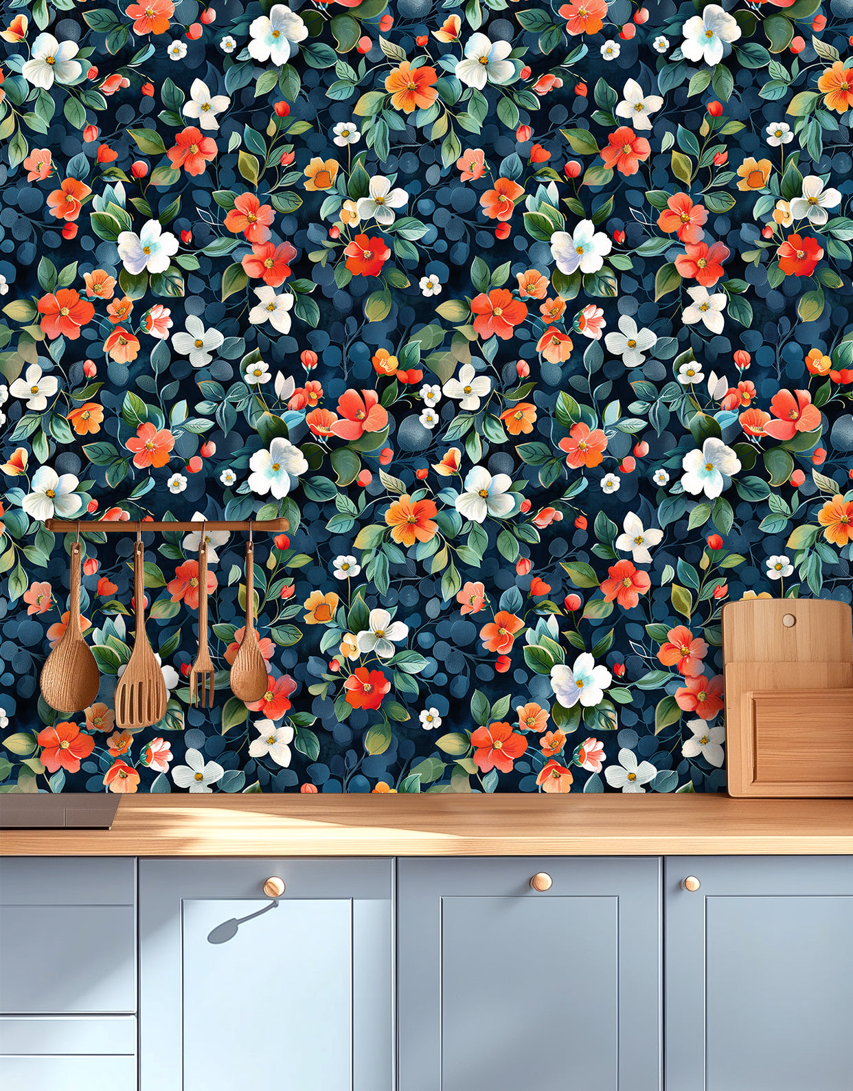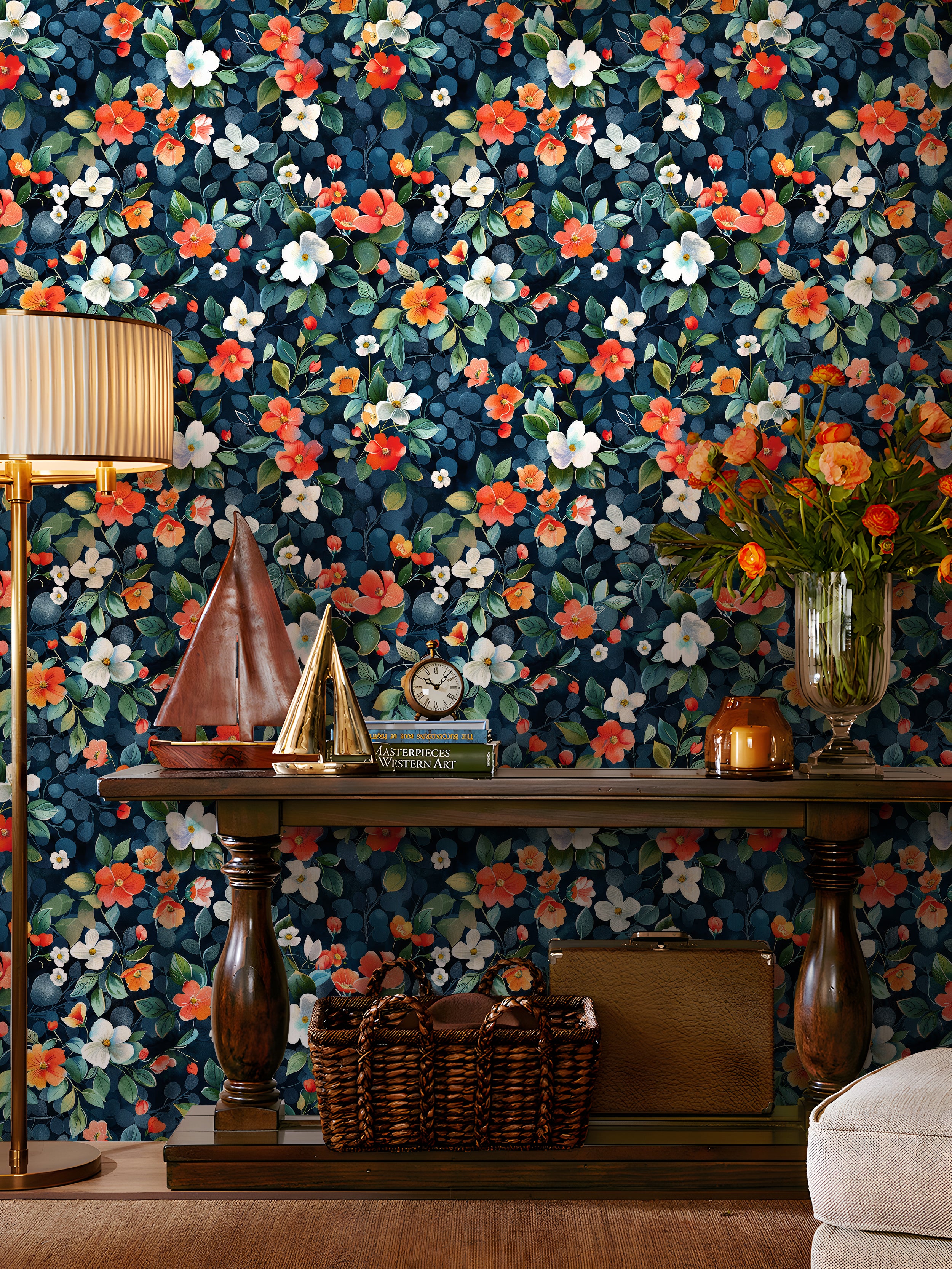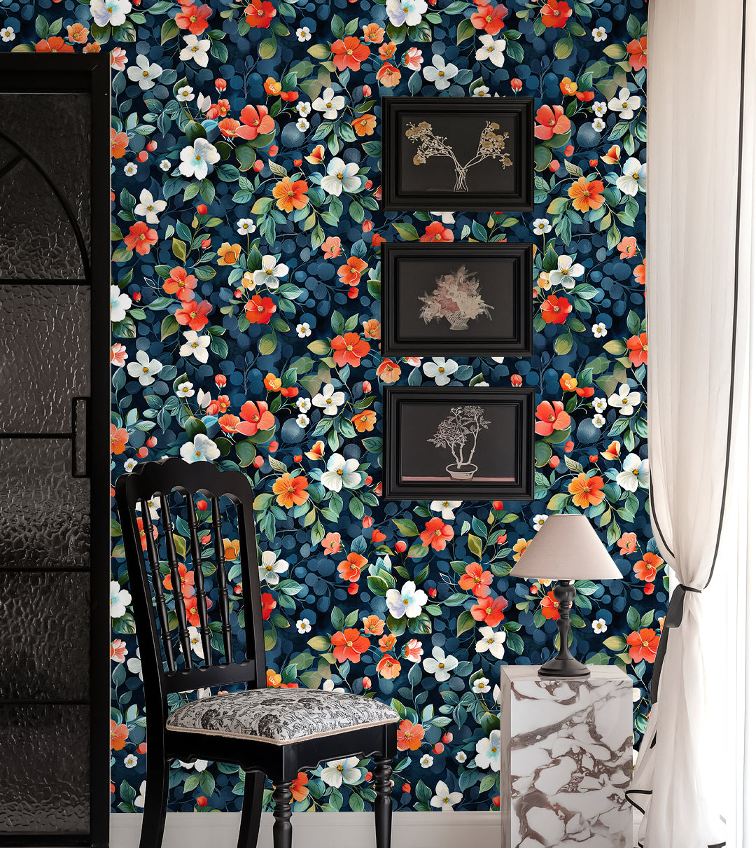 HaokHome Hand-Painted Floral Wallpaper – Vibrant Orange, White, and Yellow Flowers with Green Leaves on Dark Background