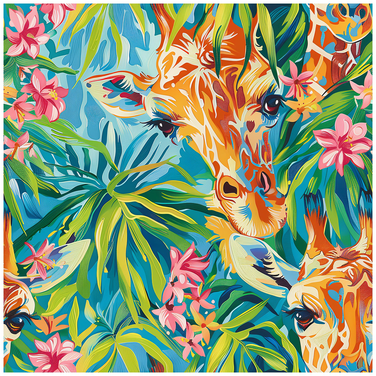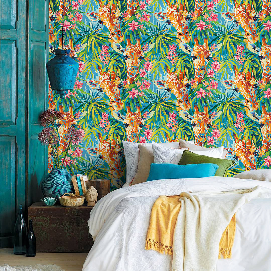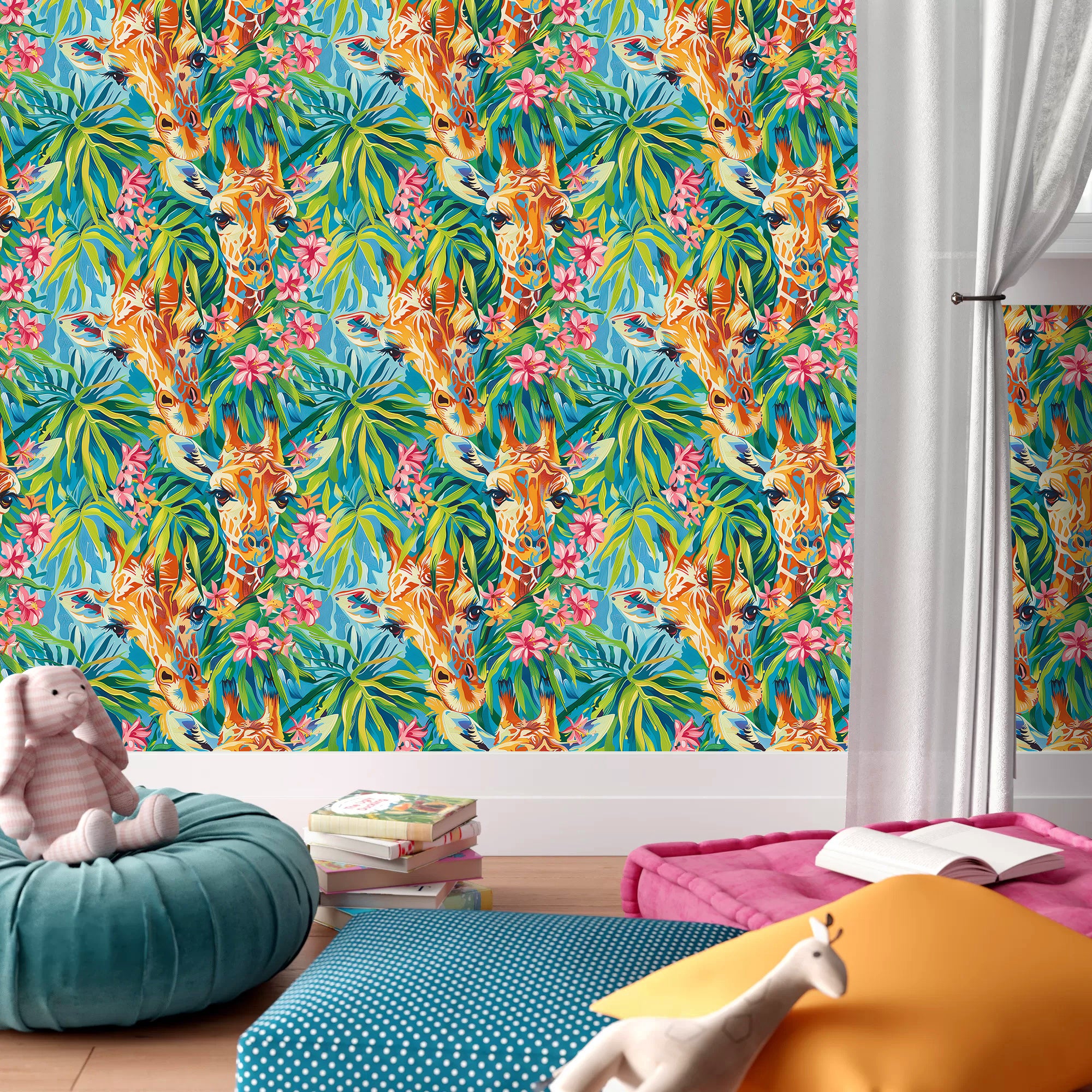 HaokHome Vibrant Giraffes and Tropical Foliage Wallpaper Bold Floral and Greenery Design with Bright Blue Background