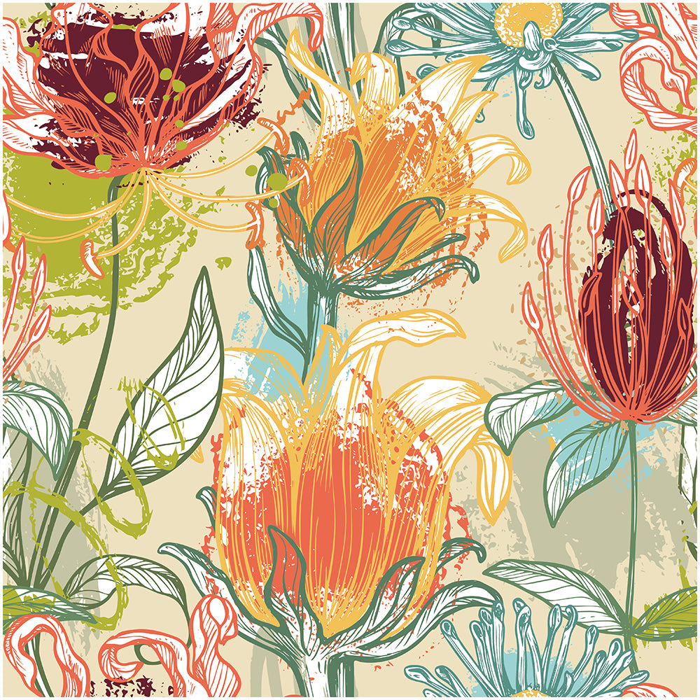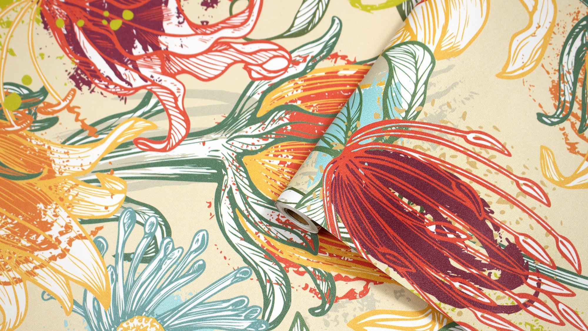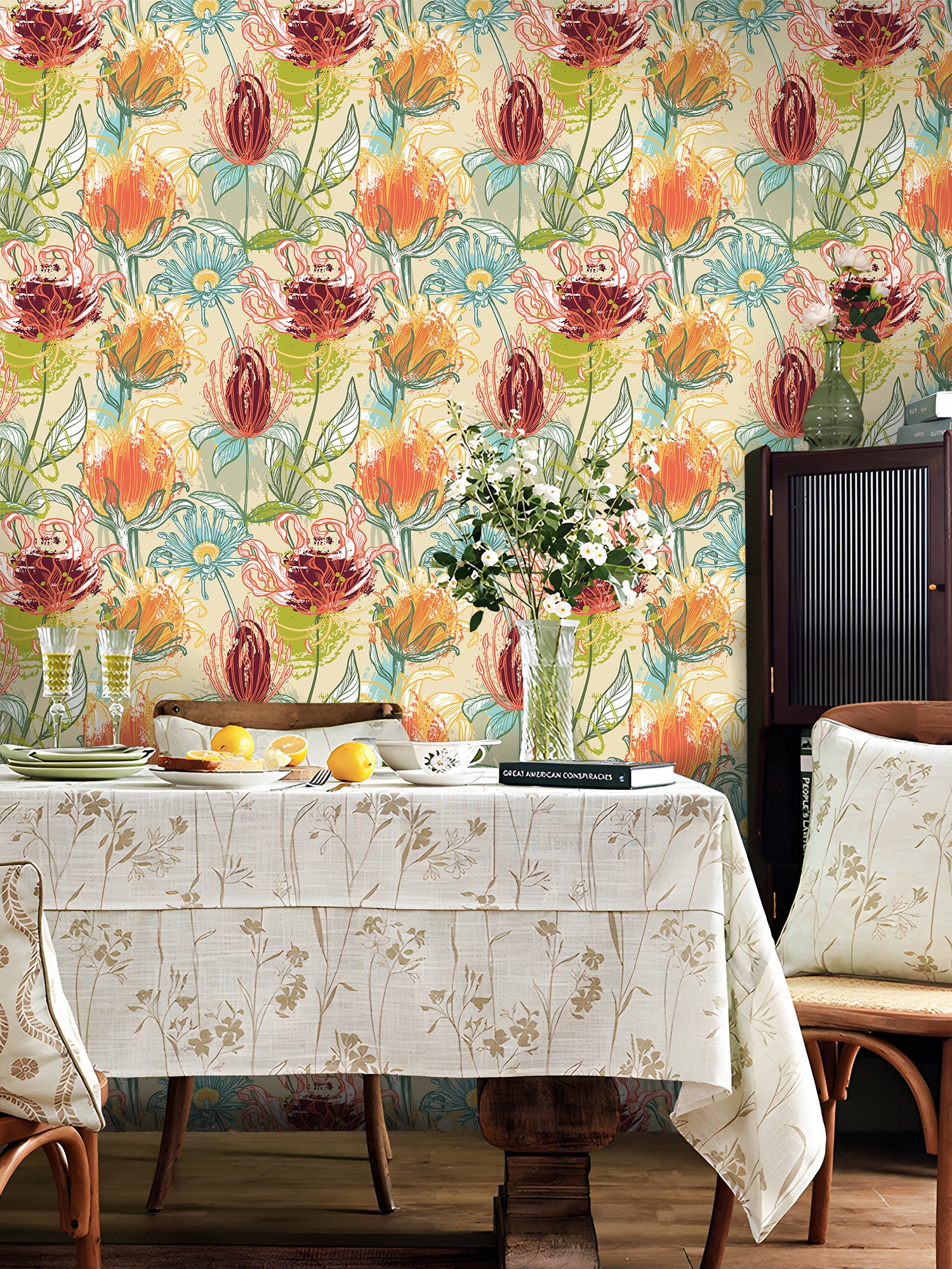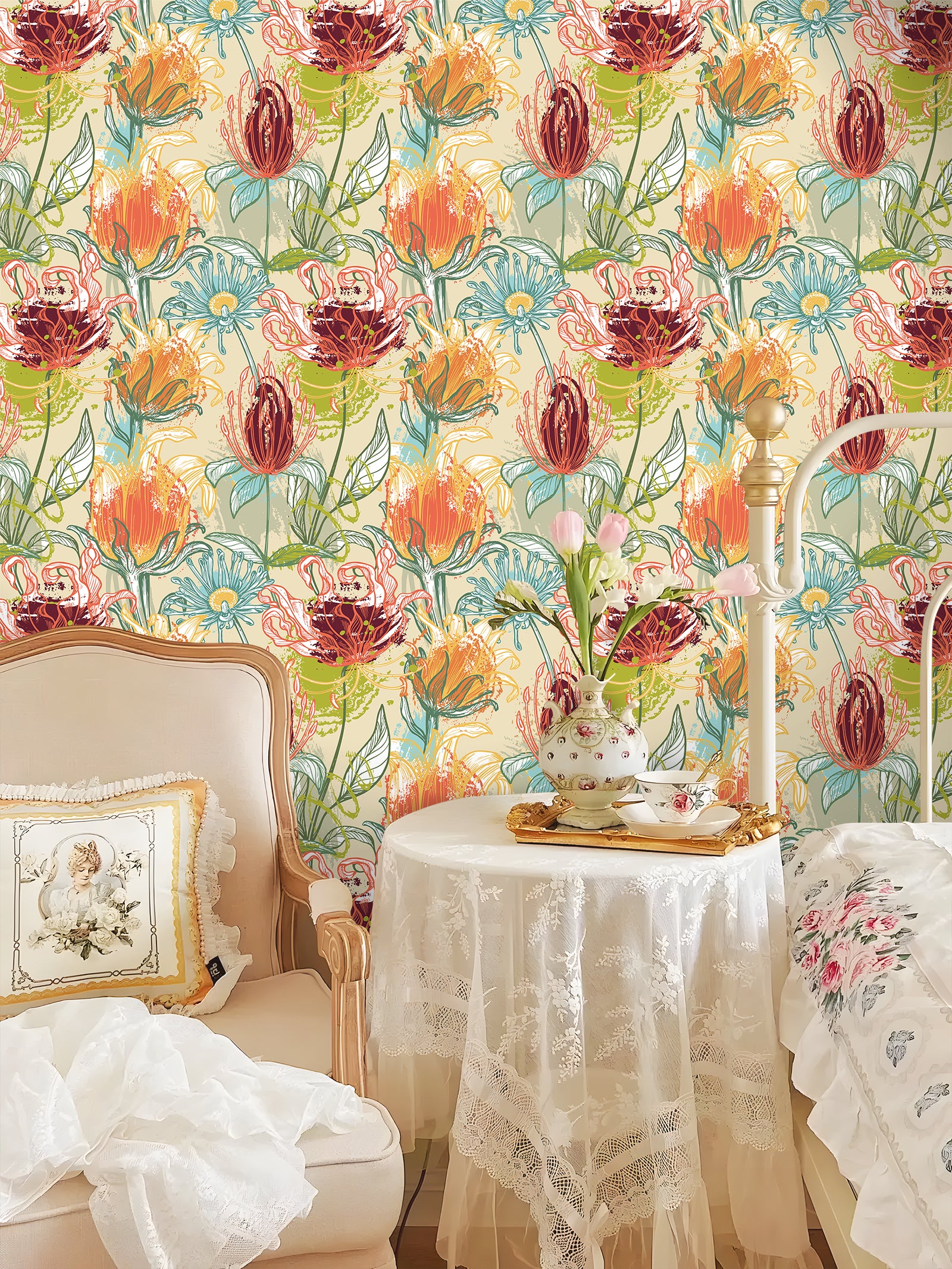 HaokHome Hand-Drawn Tropical Flower Wallpaper – Vibrant Protea, Lily, and Daisy Design with Abstract Brush Strokes on Beige Background