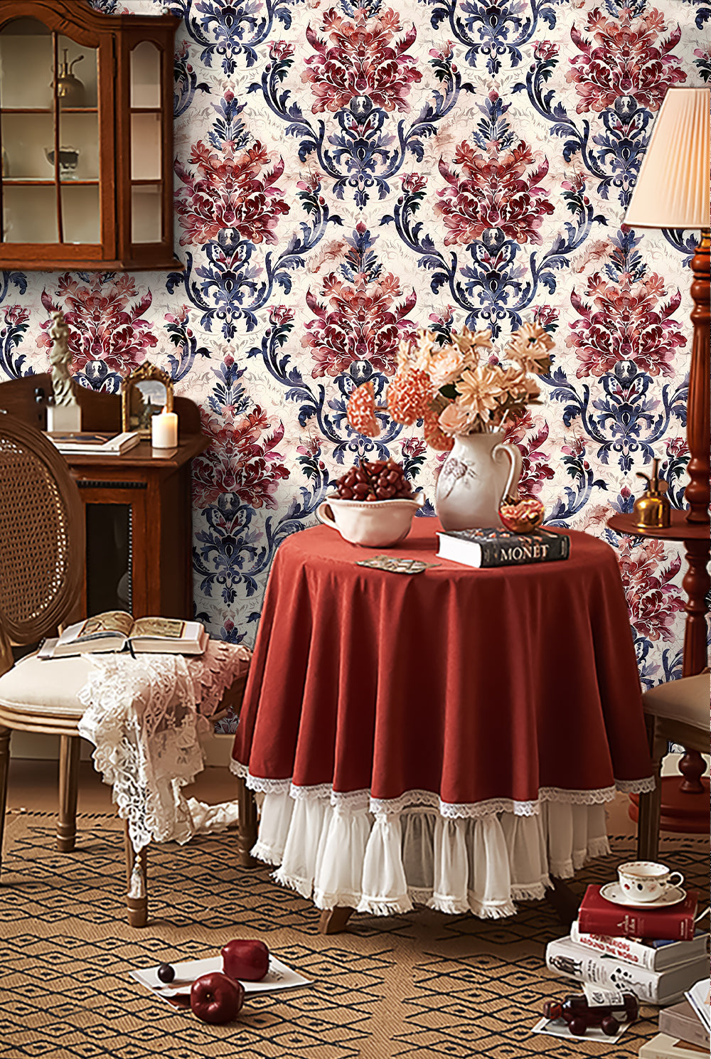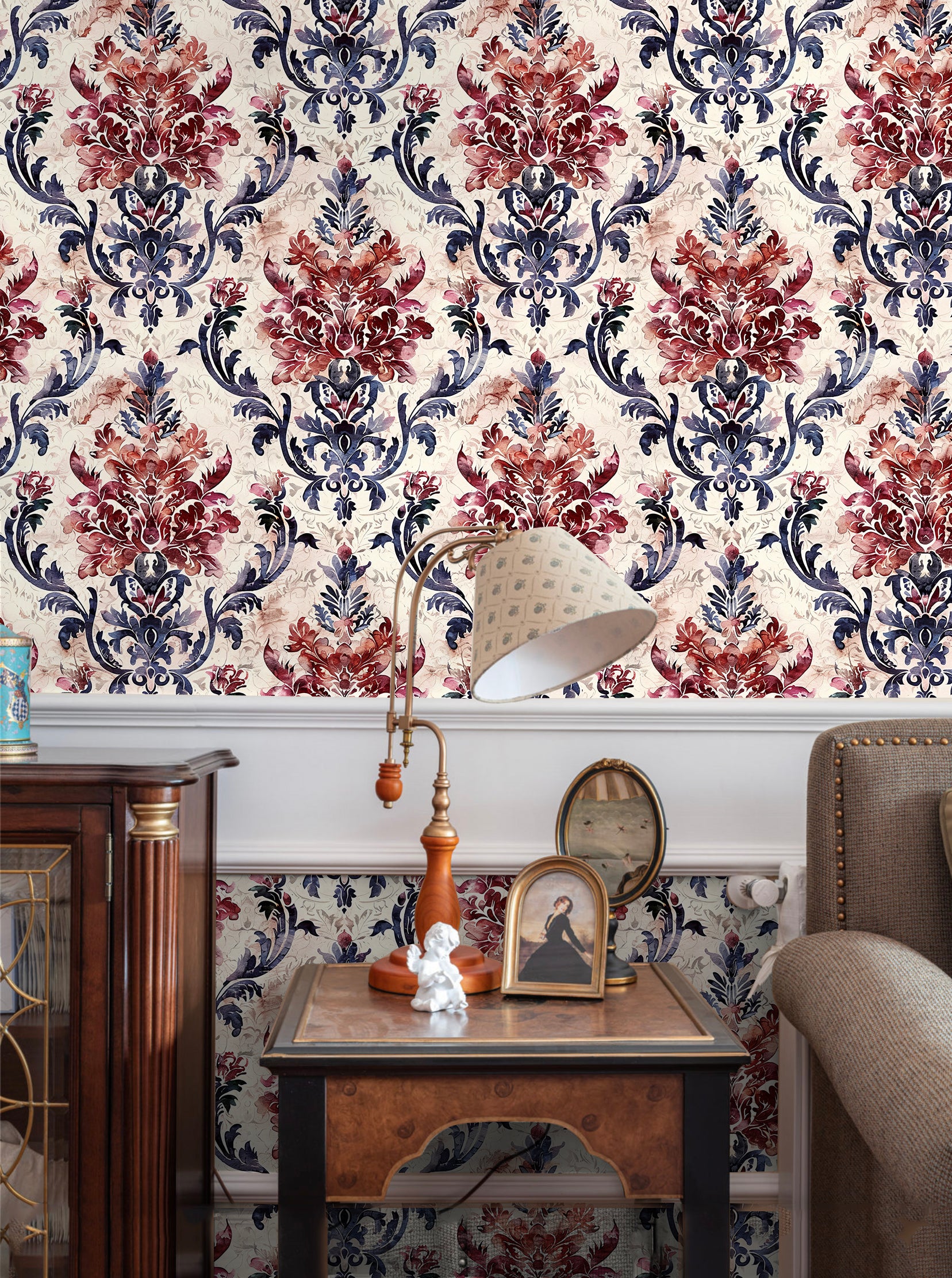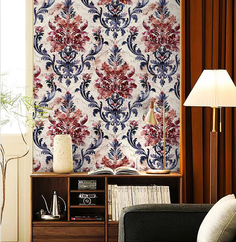 HaokHome Watercolor Damask Wallpaper – Elegant Burgundy, Navy Blue & Cream Floral Design for Living Room & Bedroom