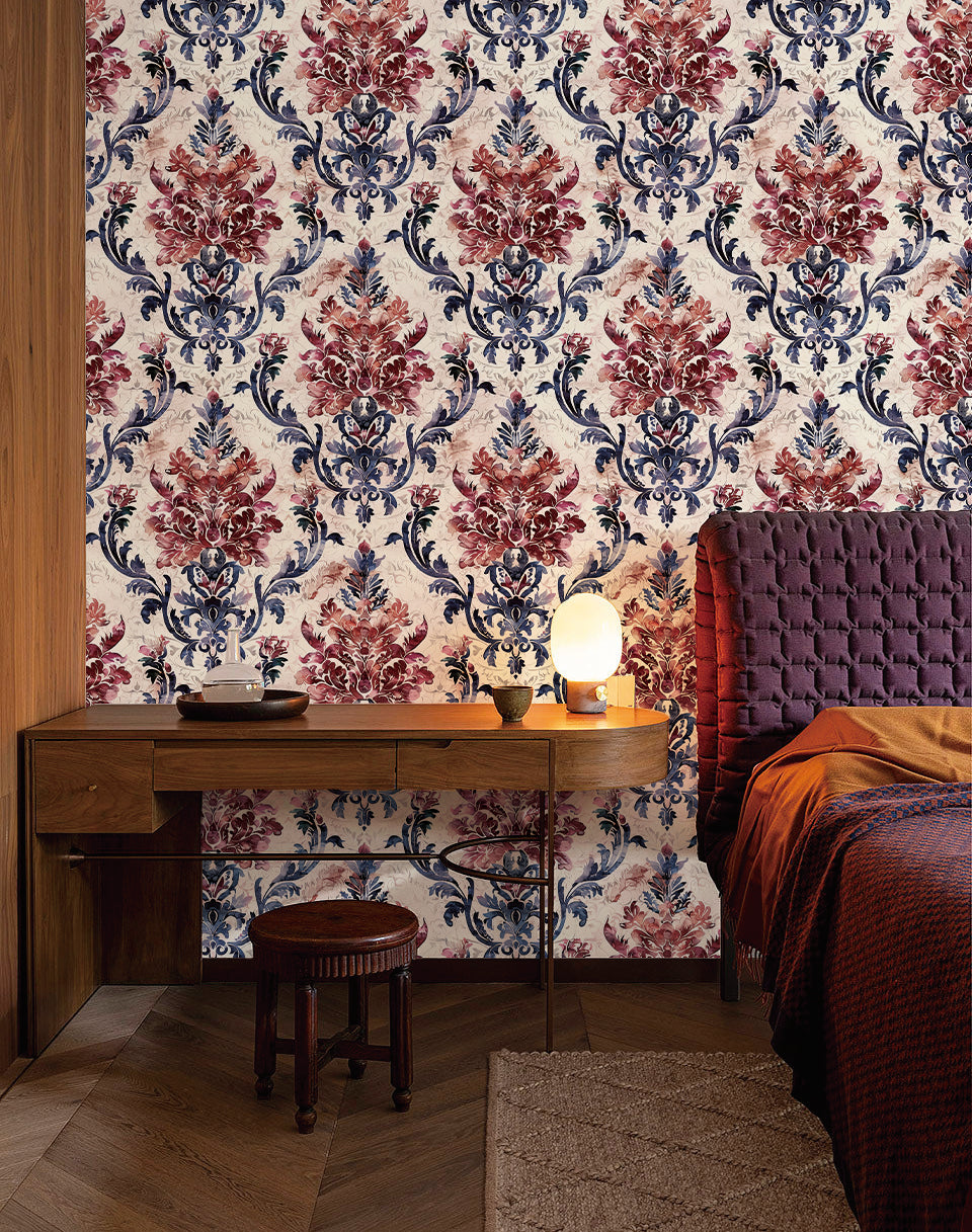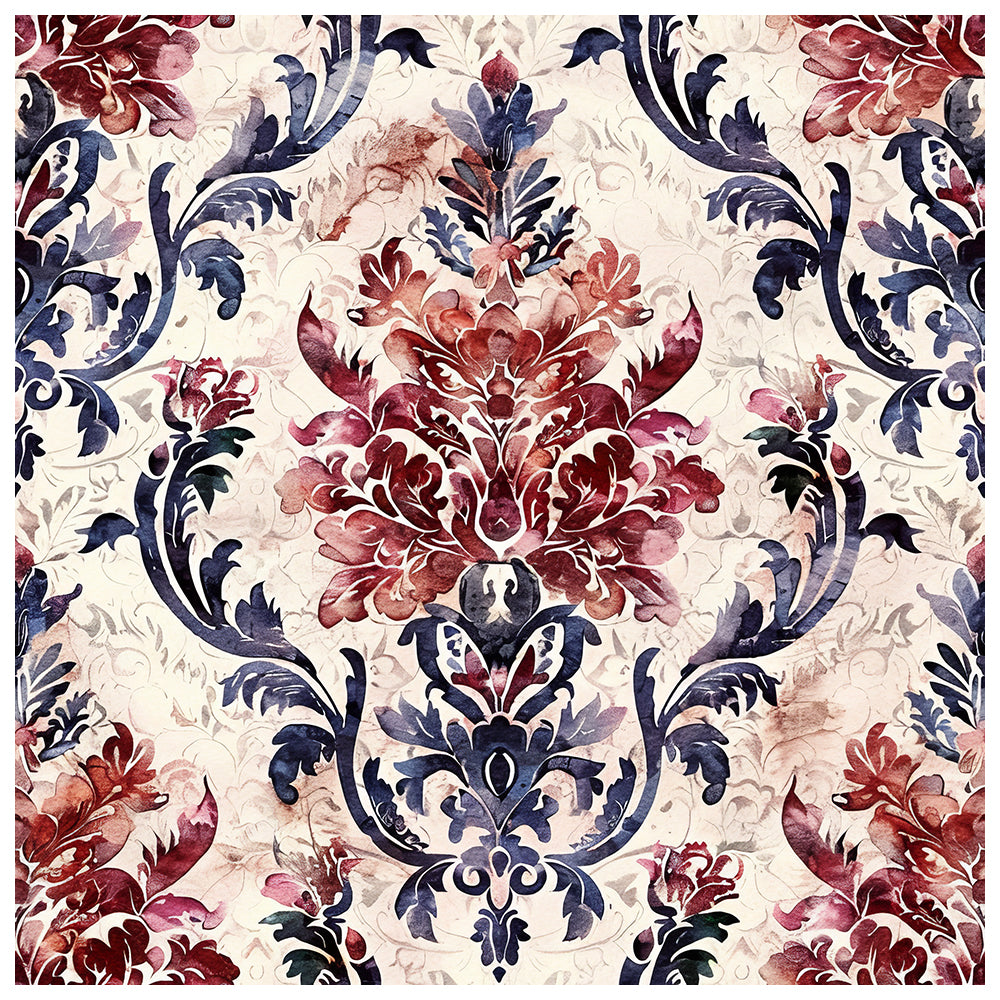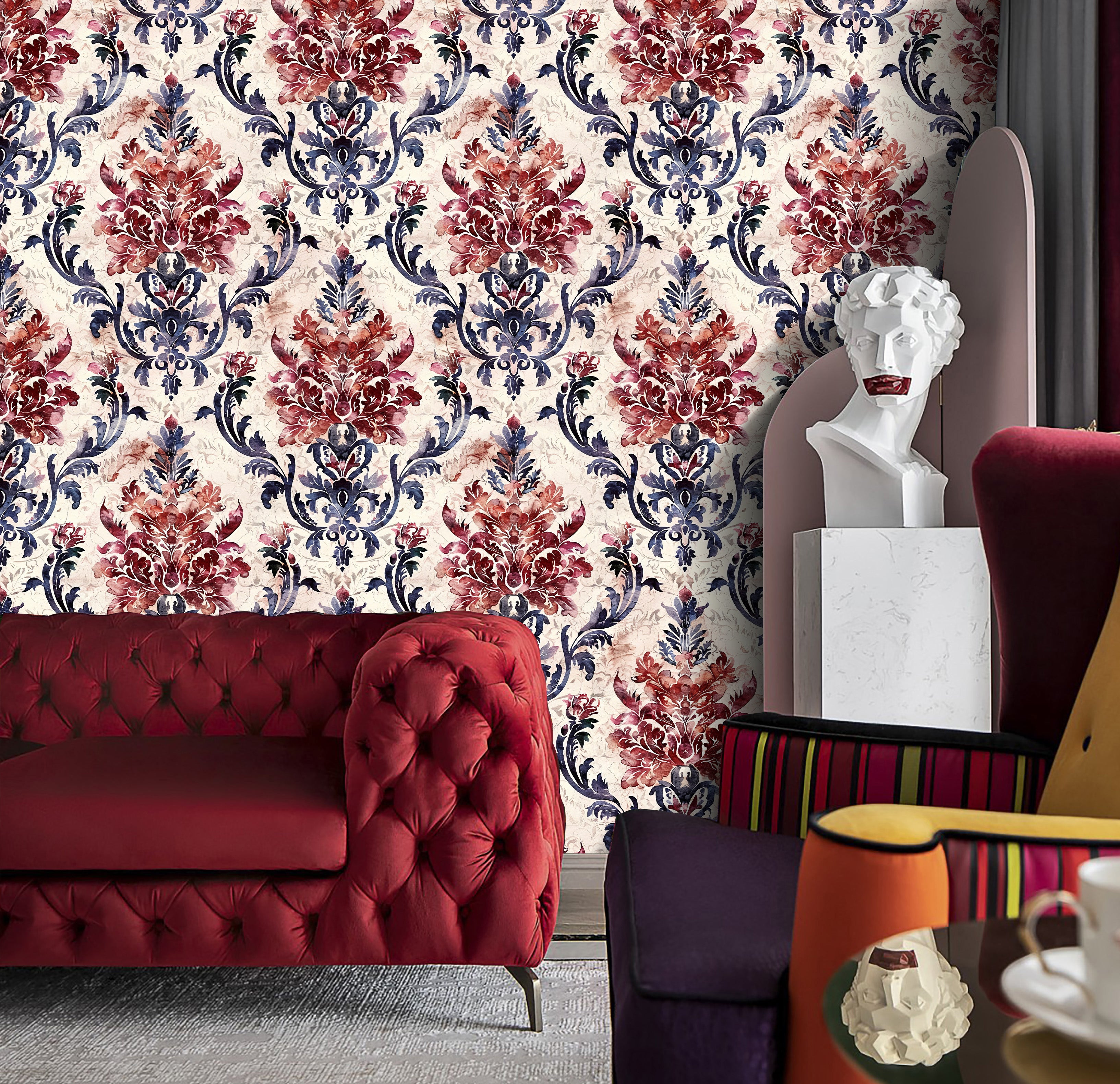 HaokHome Watercolor Damask Wallpaper – Elegant Burgundy, Navy Blue & Cream Floral Design for Living Room & Bedroom