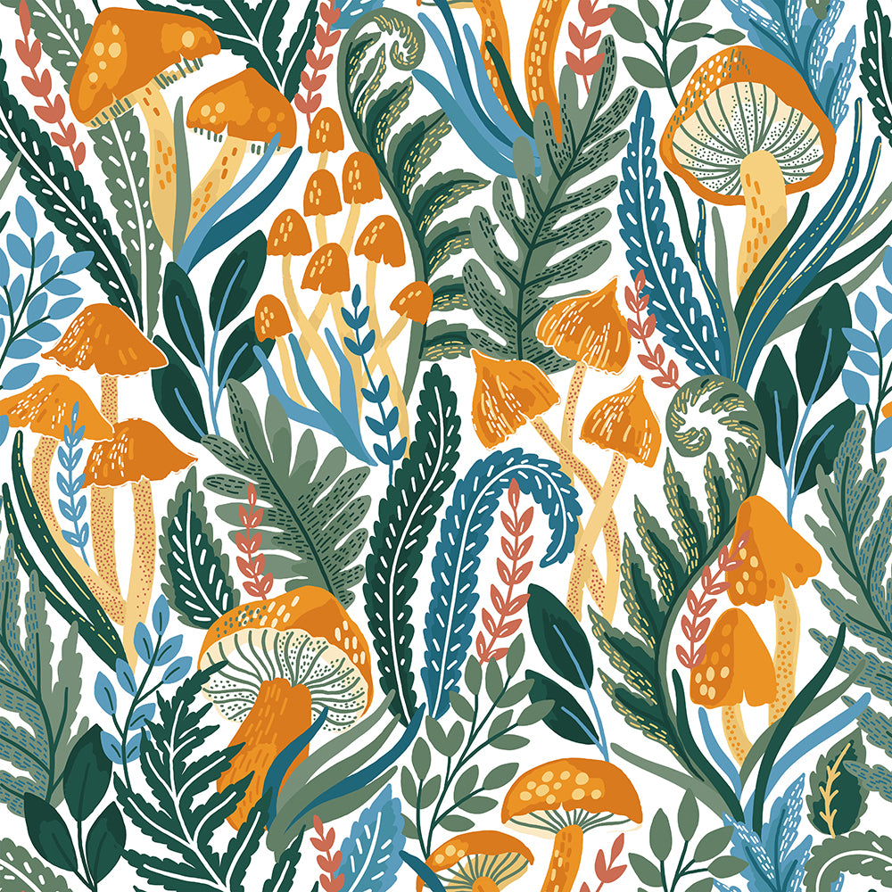 HaokHome Hand-Drawn Mushroom and Foliage Wallpaper – White Background Nature Mural for Living Room & Bedroom